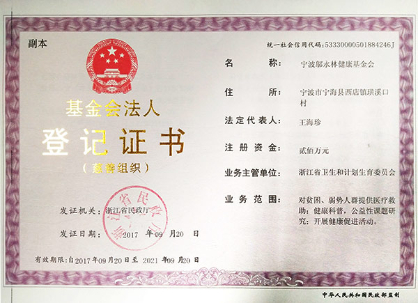 寧波鄔永林健康基金會(huì),成立于2010年10月,是在浙江省民政廳注冊(cè)、由浙江省衛(wèi)生健康委主管的非公募基金會(huì)?;饡?huì)的原始基金數(shù)額為人民幣貳佰萬元,來源于雙林集團(tuán)股份有限公司。《慈善法》頒布后,本基金會(huì)被認(rèn)定為慈善組織。